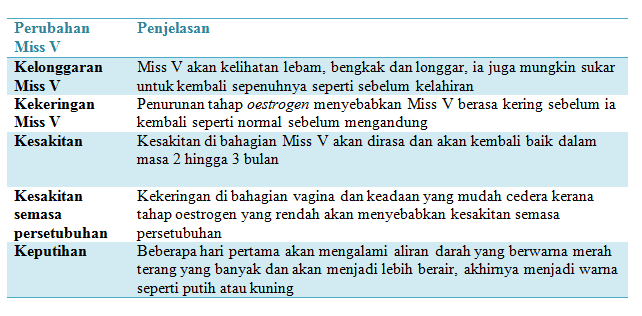 Selepas bersalin secara semulajadi, Miss V tidak akan kembali sama seperti sebelumnya. Semasa mengandung, penghasilan hormon seperti estrogen dan relaxin menyediakan badan untuk bersalin apabila tiba masanya.